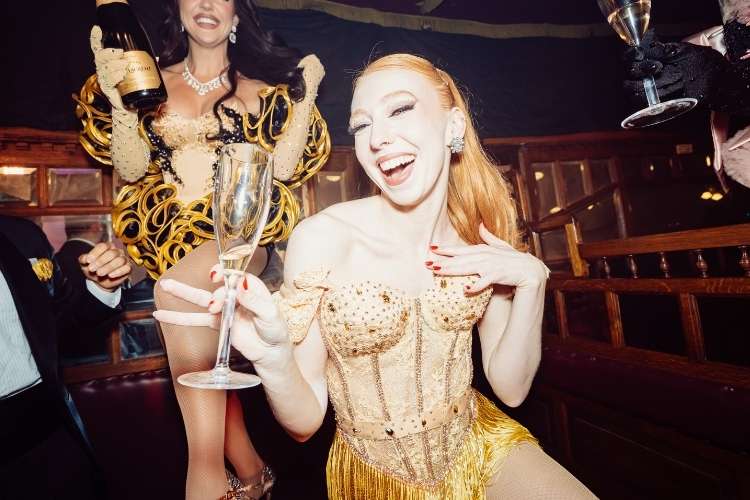 'Blanc De Blanc Encore' is an immersive, glitzy glamorous cocktail party, we invite the audience into our world with live singing, world class circus acts, incredible dancing and hilarious comedy. You know when one champagne turns into another and another and another. . . Let the fun night out begin! Immaculate vibes and full of cheeky unexpected surprises! I’ll give one surprise away. . . I hang upside down above the audience pouring champagne – Salute!