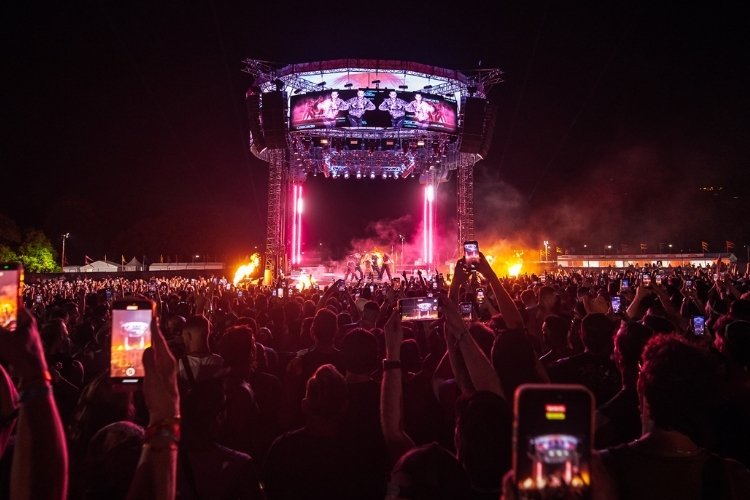 The stage is uniquely positioned in the middle of the festival, the top featuring massive screens and support beams showcasing ascending light shows.