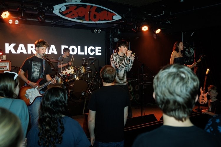 No delay. Karma Police (Willem on vocals, Will on guitar, Madi on bass, Isaac on drums) are straight in, firing up the room. They belt through covers: Fontaines D.C.'s 'In ár gCroíthe go deo', Pixies' 'Monkey Gone To Heaven', and Silverchair's